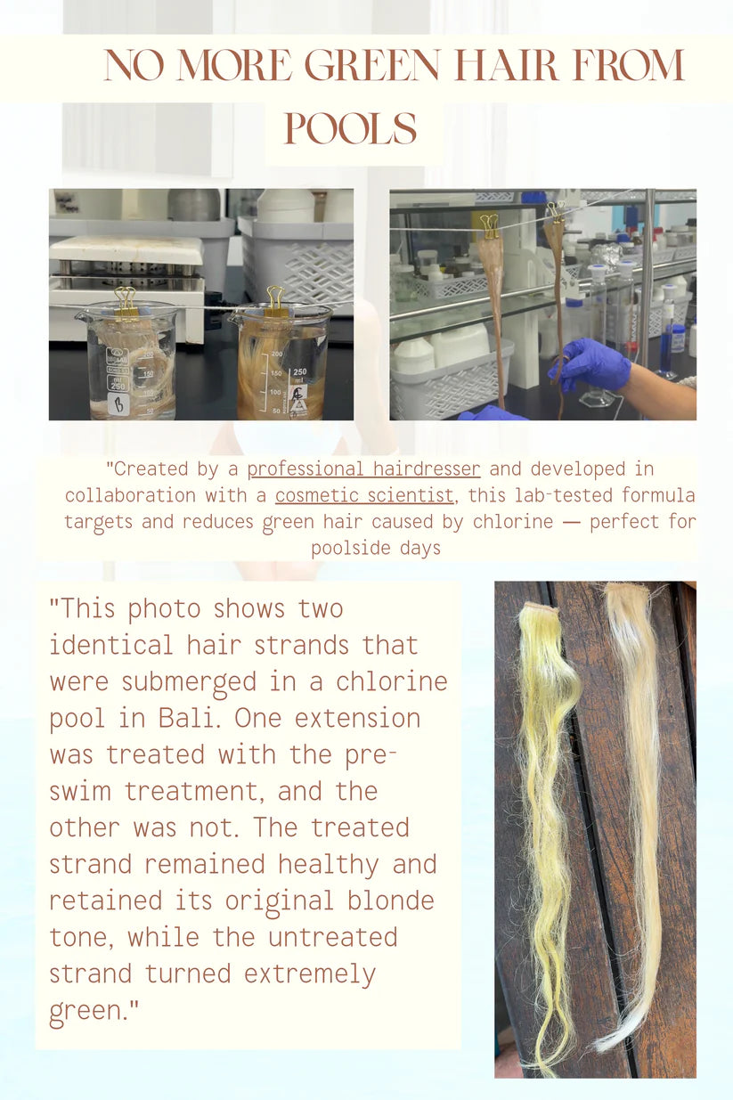 Pre-Swim acts like an invisible swim cap — shielding your hair from the harsh effects of chlorine, saltwater, and UV rays.